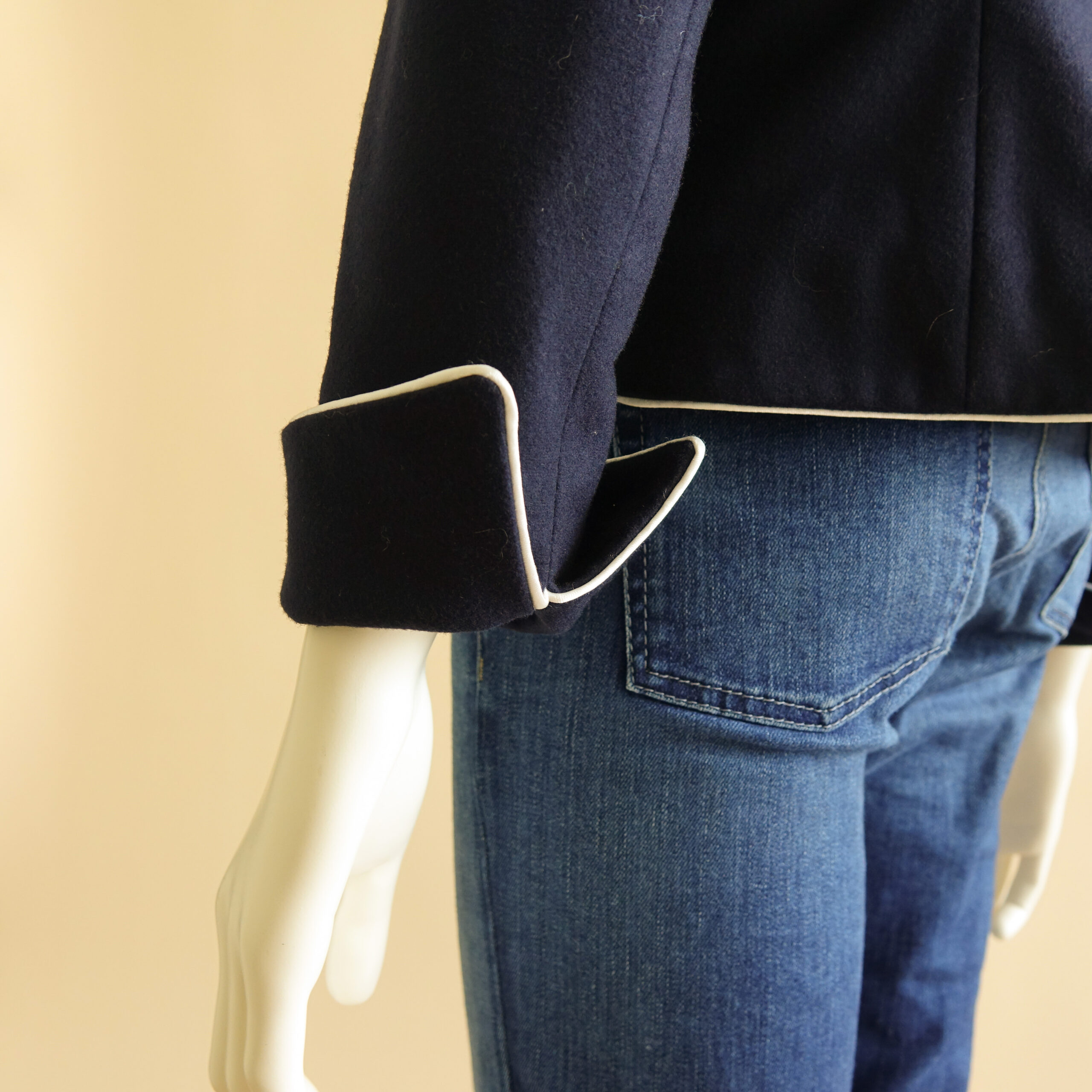 Zelfs de binnenkant moet mooi zijn! De naden van de broek zijn afgebiesd met satijn. De blazer is afgewerkt met piping rondom. Door middel van moulage creëer je volume en beweging.