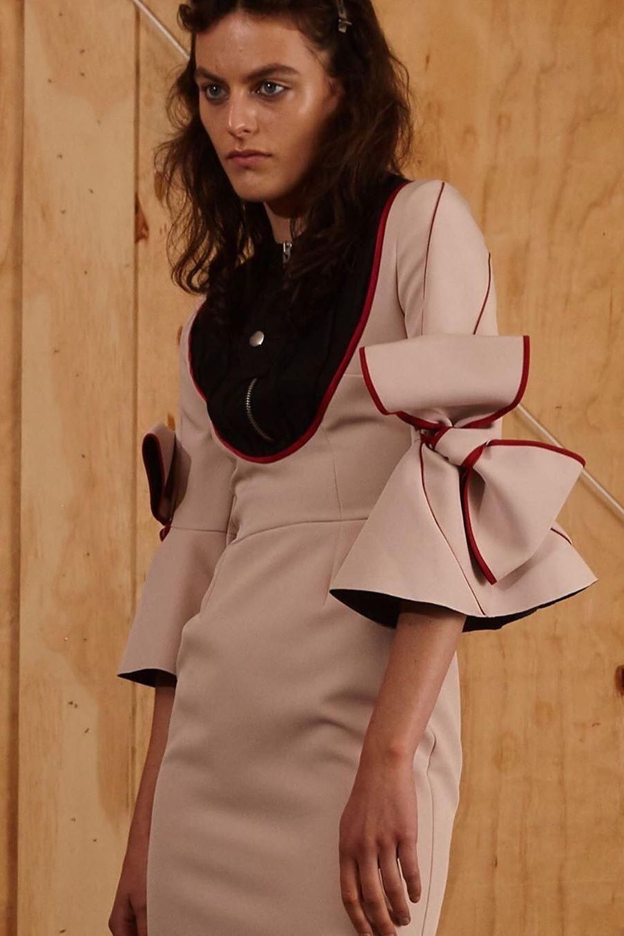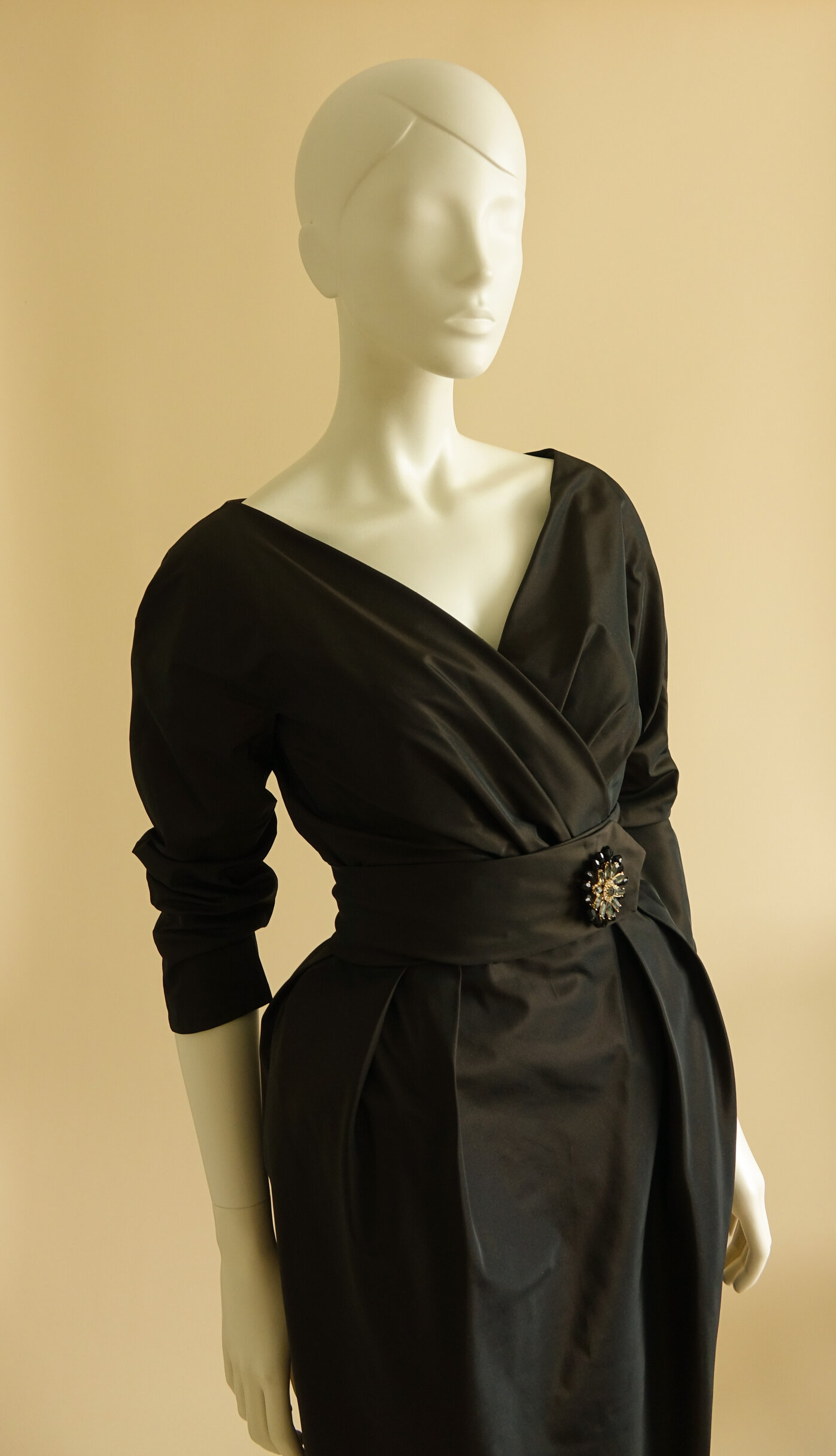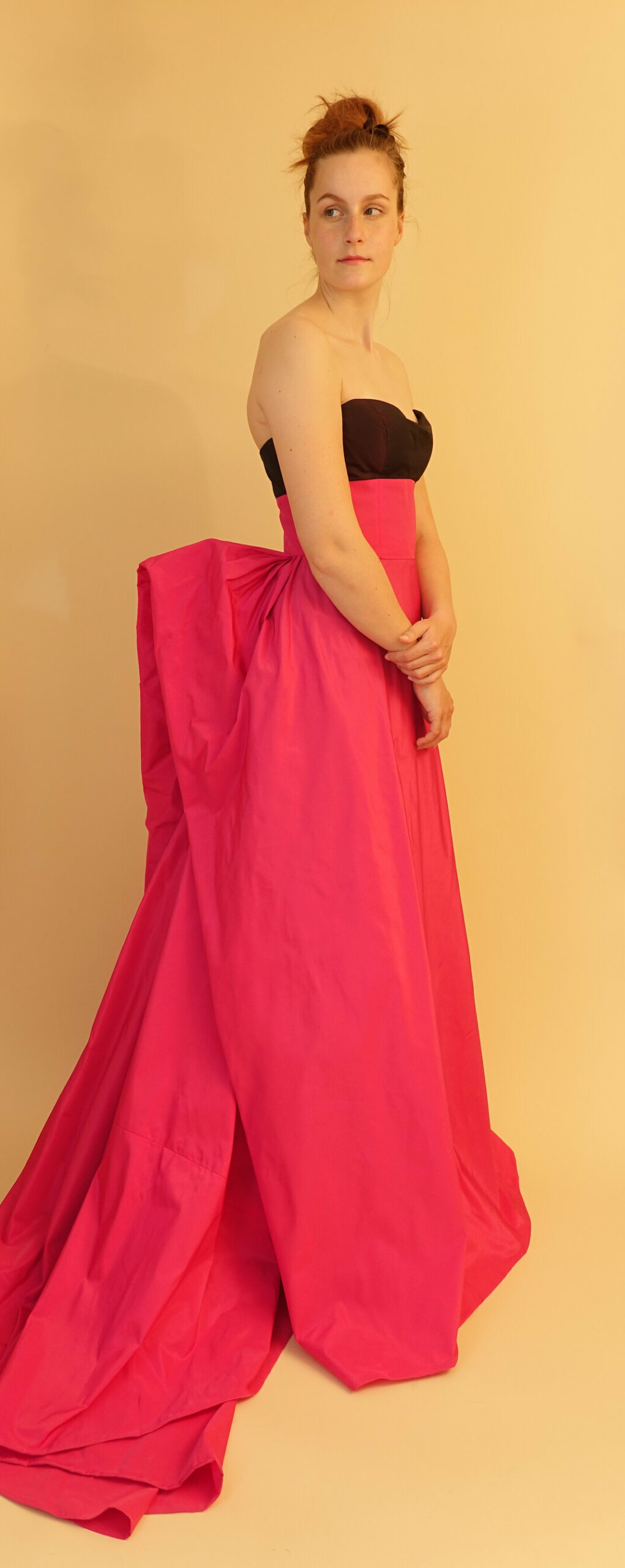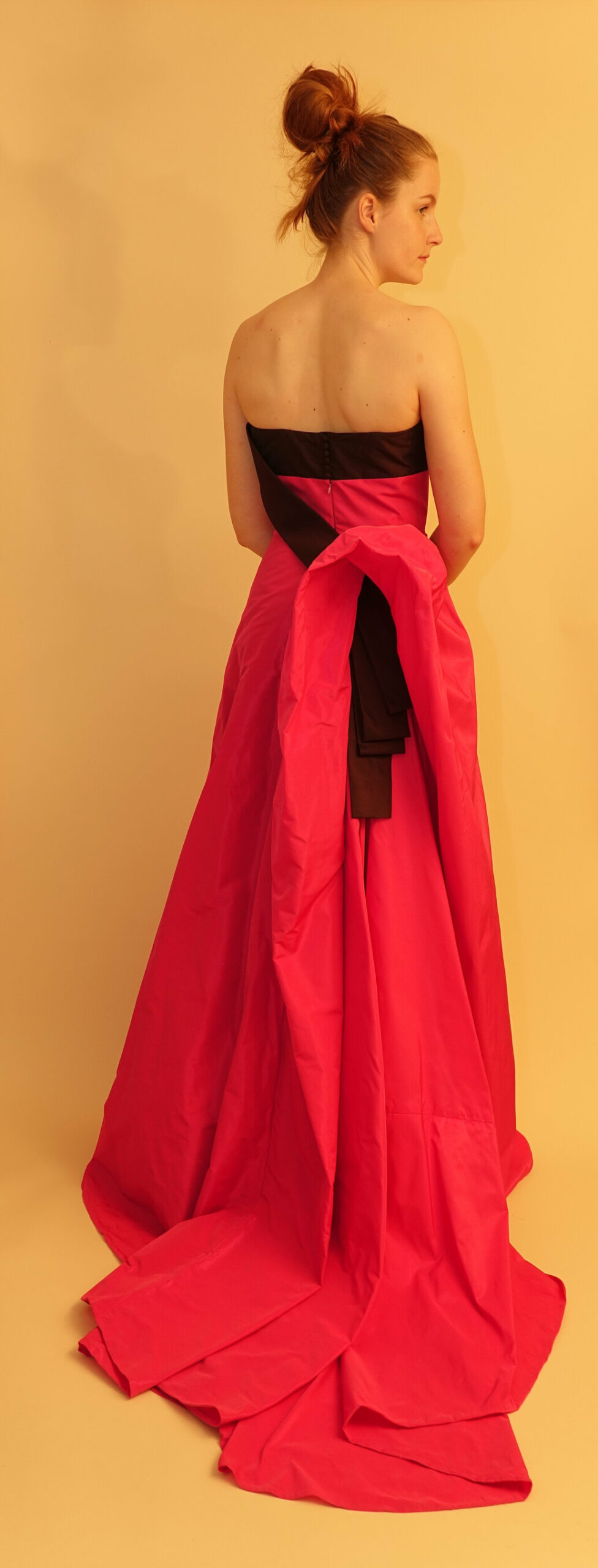 Een replica van een ontwerp van Caroline Herrera. De jurk valt op door de draperie aan de achterzijde die door de sjerp als het ware wordt aangetrokken. De jurk wordt op z’n plek gehouden door een binnenkorset van poplin.