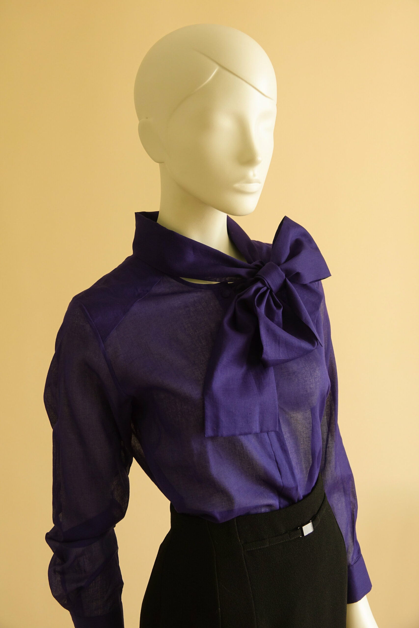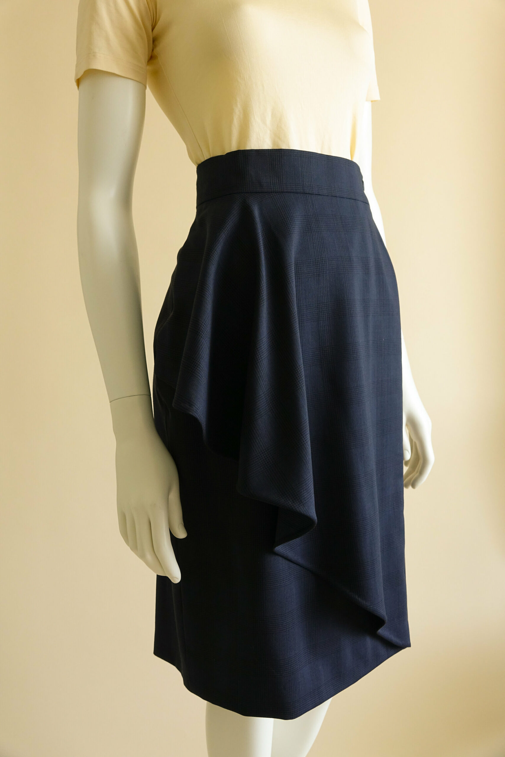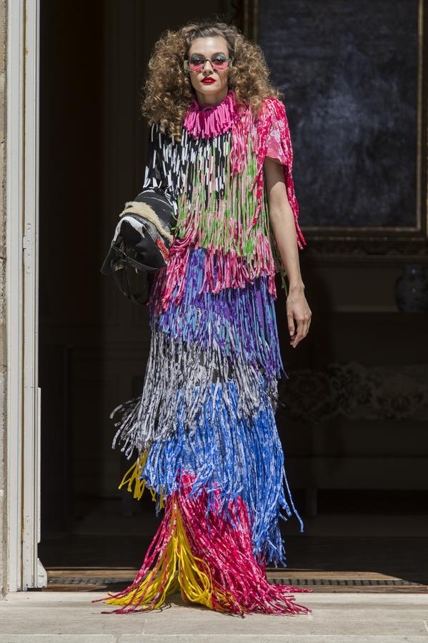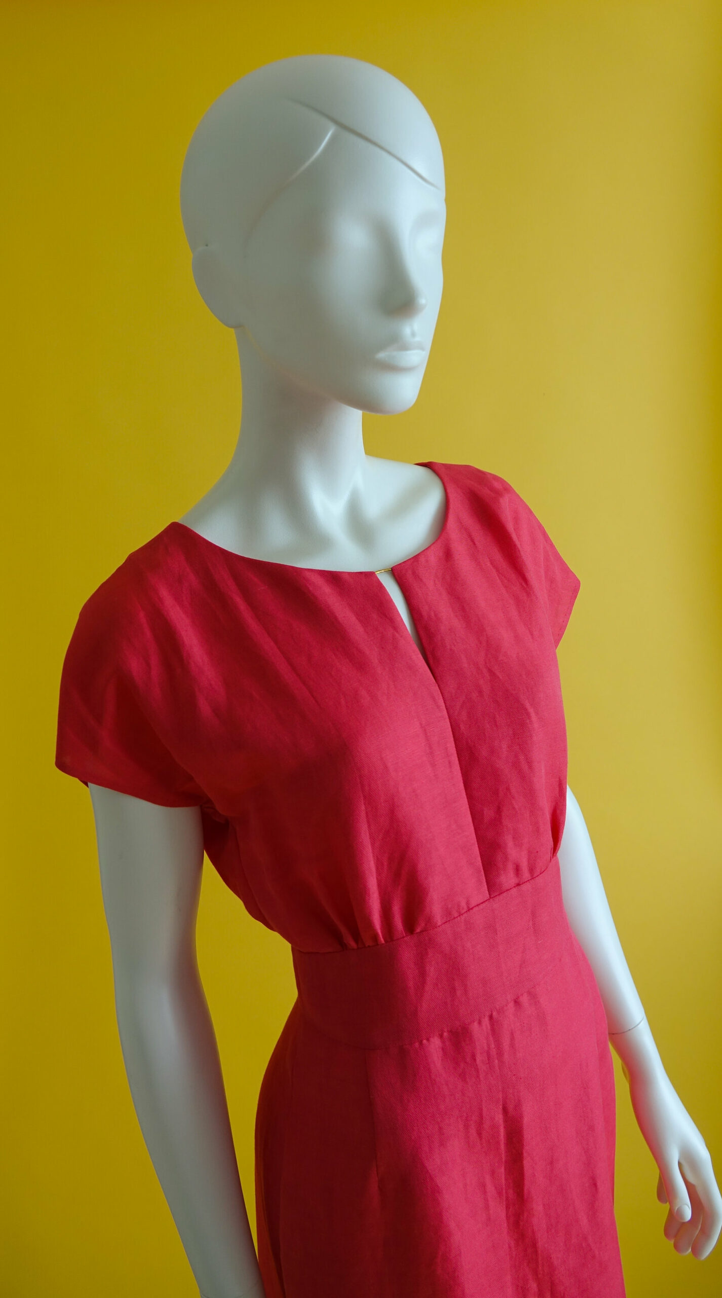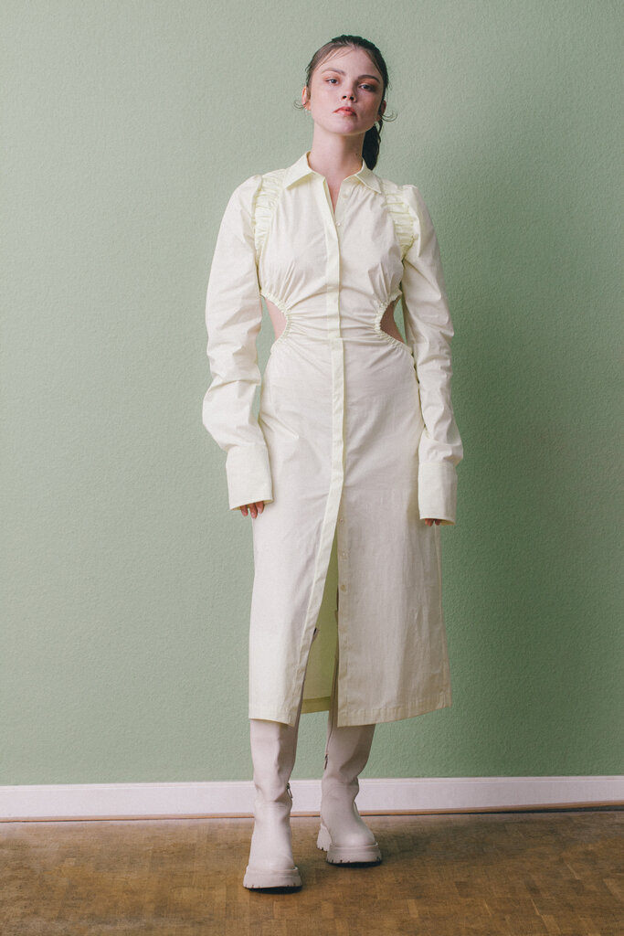 Een replica van een ontwerp van Caroline Herrera. De jurk valt op door de draperie aan de achterzijde die door de sjerp als het ware wordt aangetrokken. De jurk wordt op z’n plek gehouden door een binnenkorset van poplin.