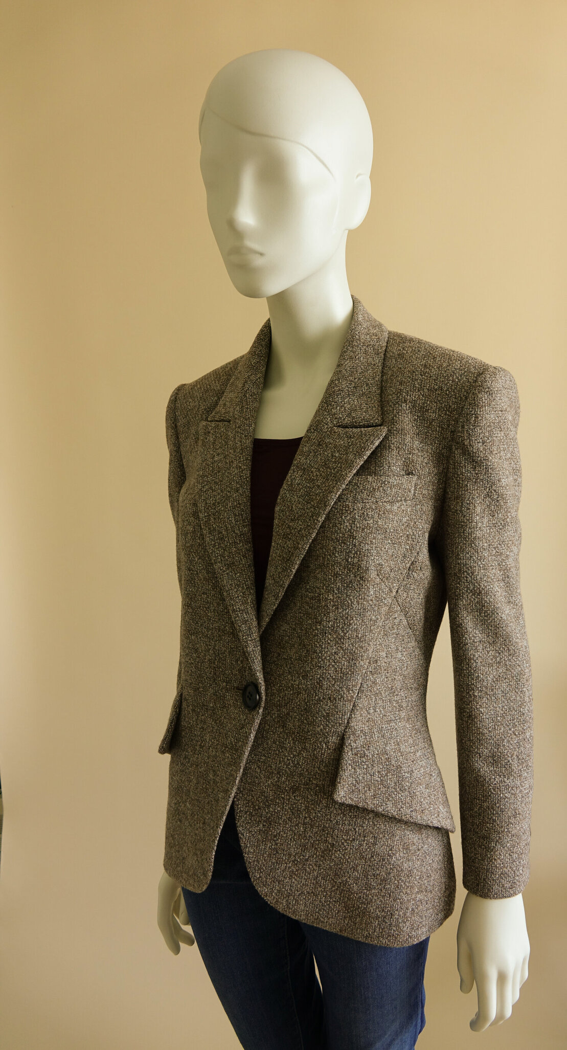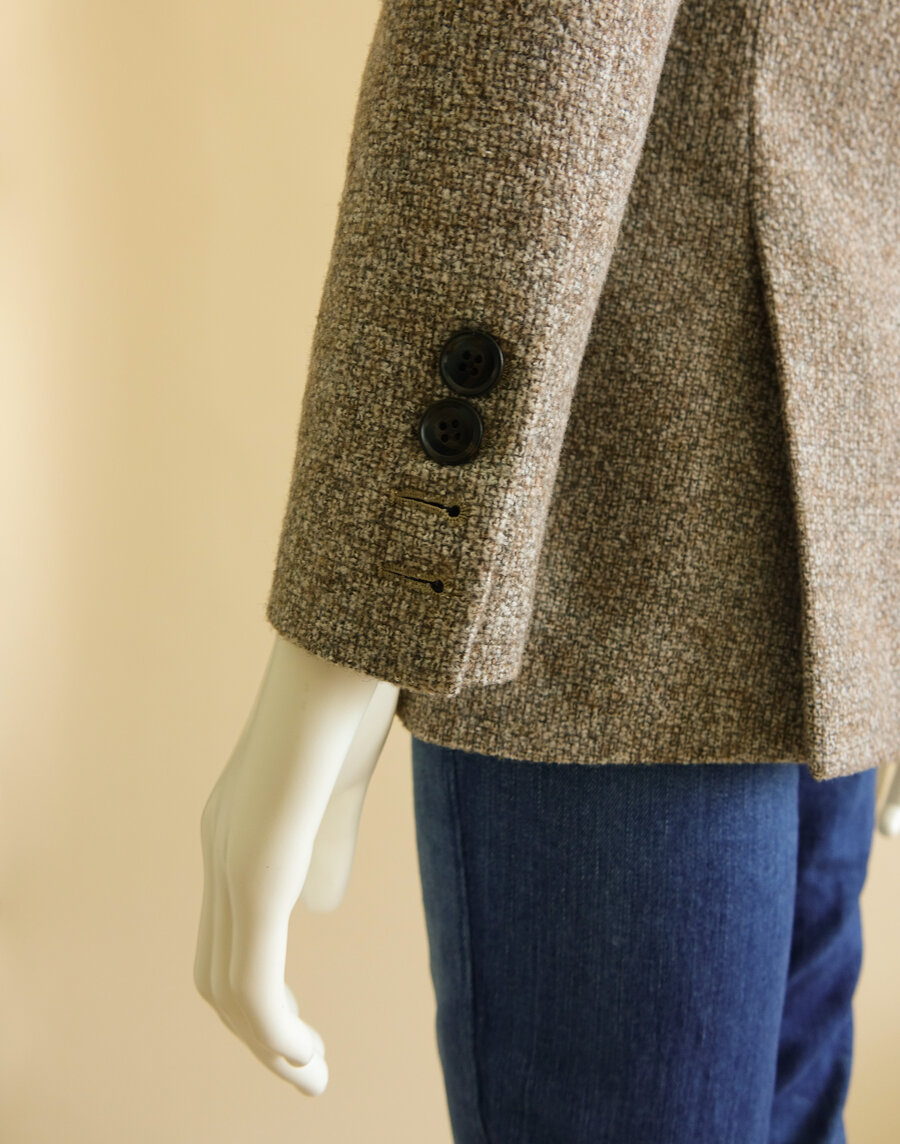 Dit jasje is een replica van een ontwerp van Alexander McQueen. De coupenaden kruisen elkaar en de klep van de zak is naadloos in het voorpand verwerkt. Natuurlijk hebben de mouwen hand geborduurde, werkende knoopsgaten.