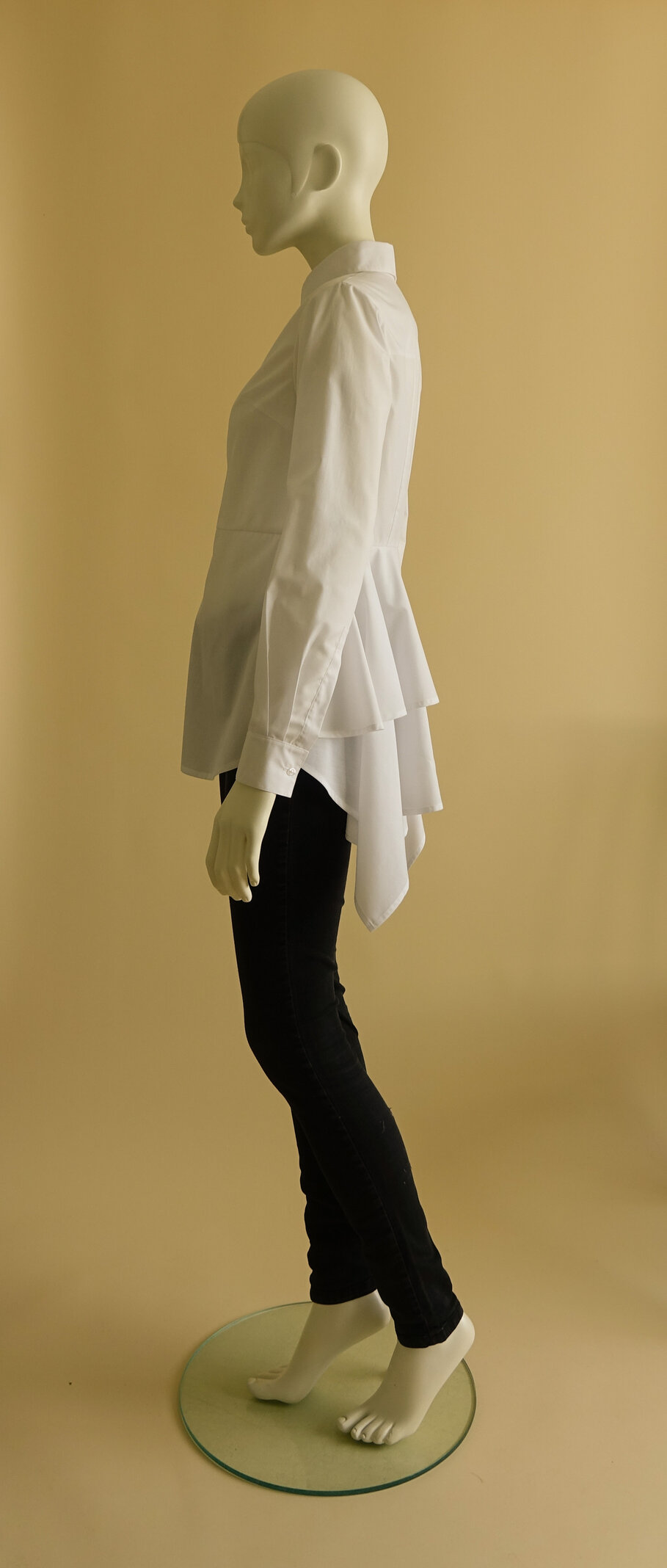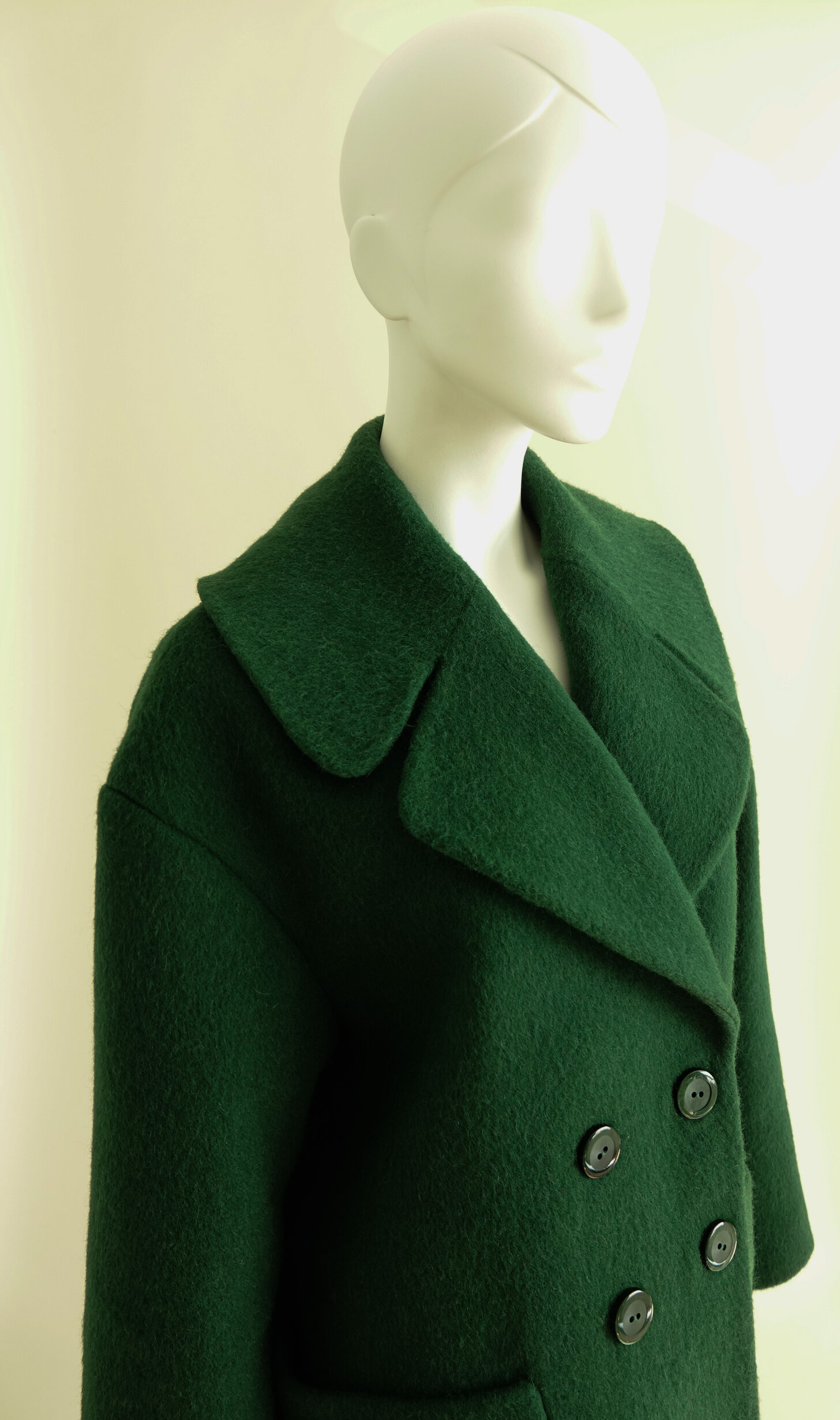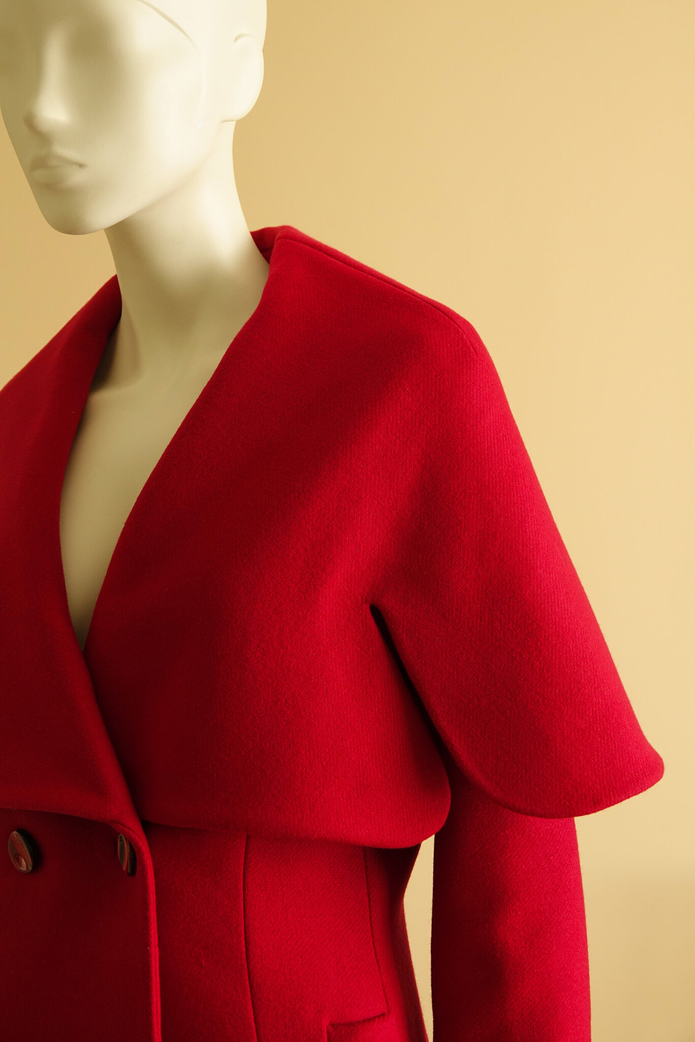 Een opvallende kraag is een echte blikvanger. De rode mantel is een replica van een Dior ontwerp. De kraag valt als een soort cape om de schouders. Door de hoge staander sluit de kraag van de groene mantel comfortabel om de hals. De uiteindelijke vorm ontstaat door moulage.