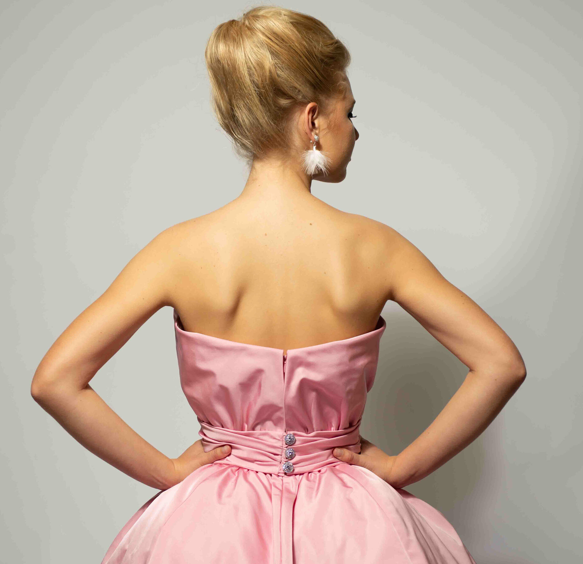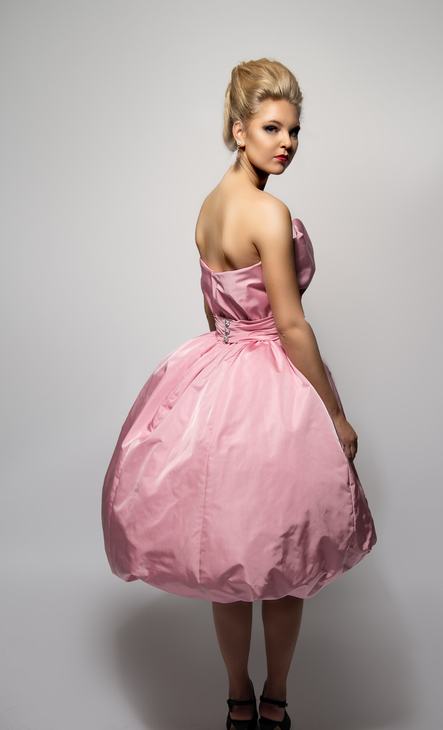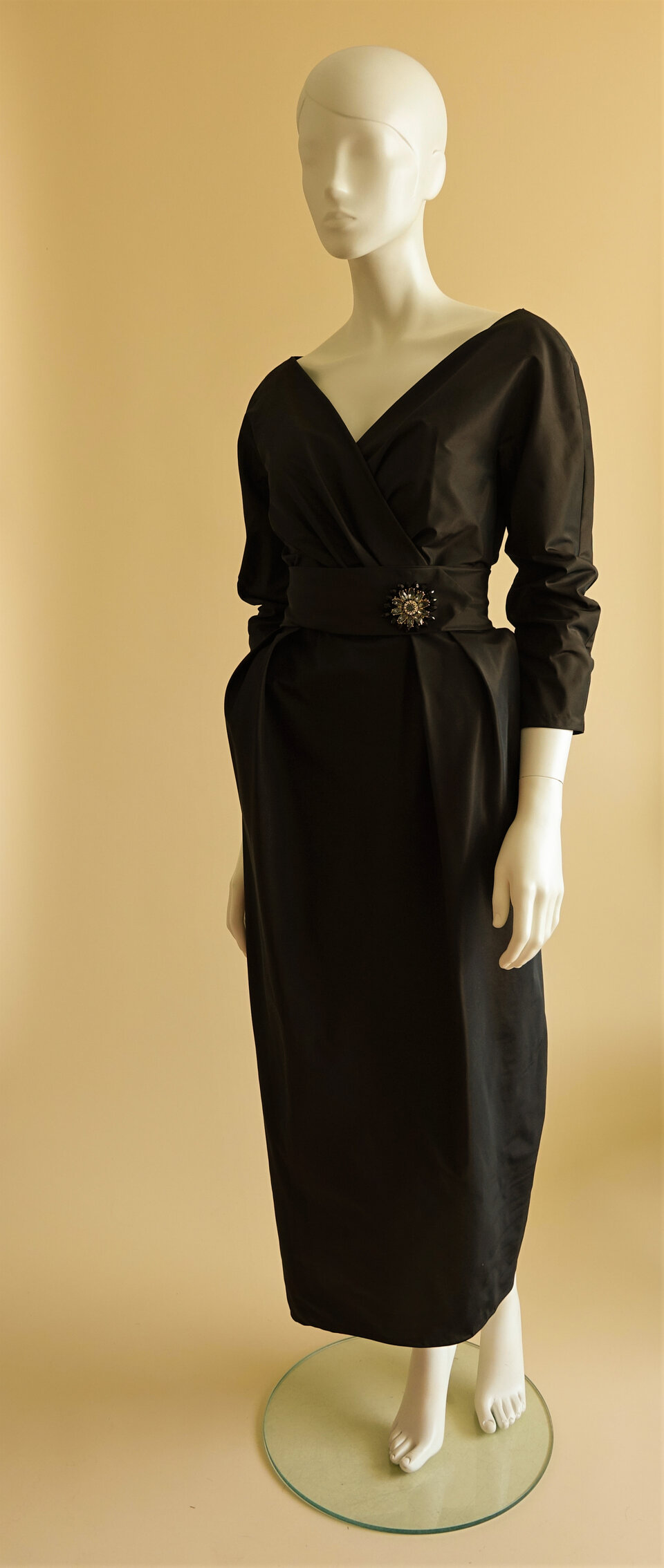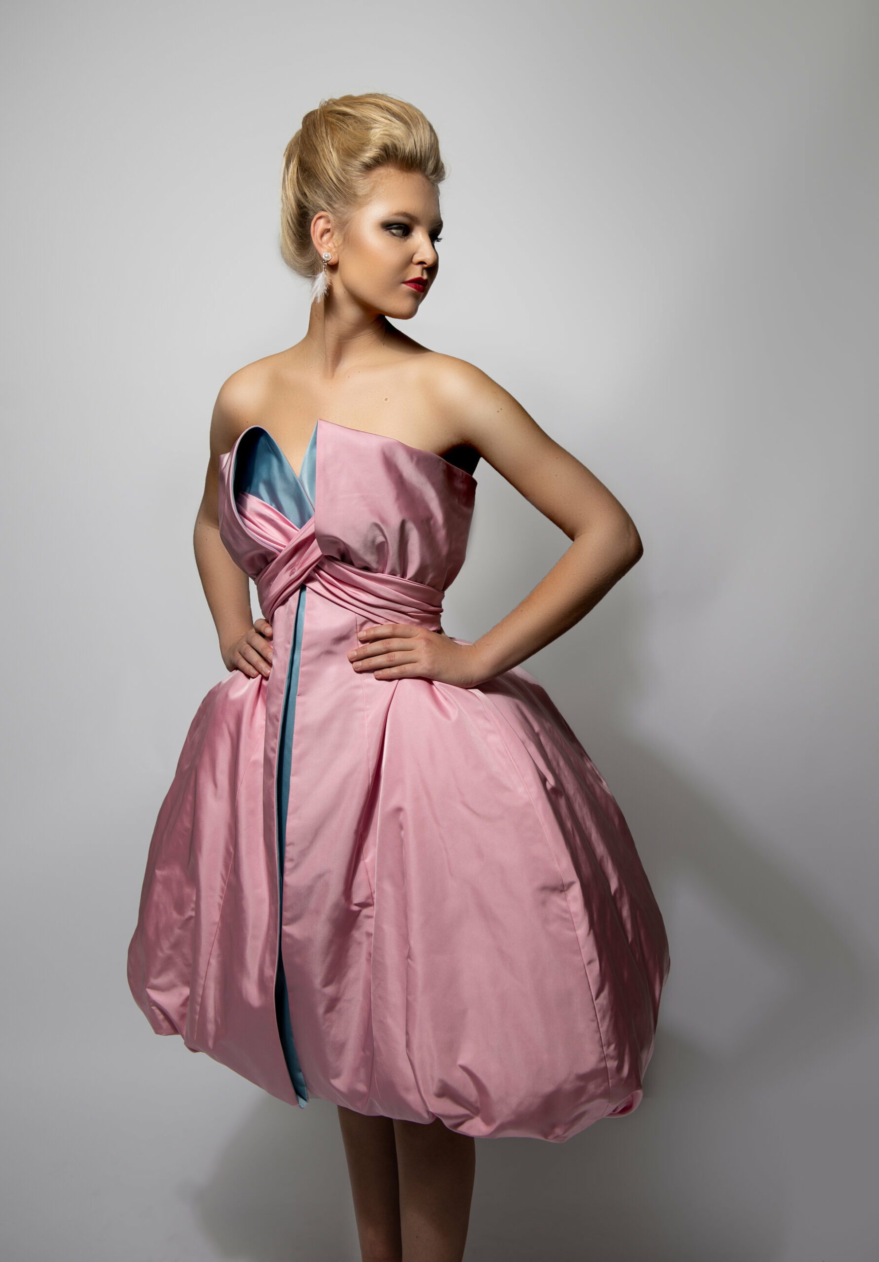 Een replica van een cocktail japon van Jacques Heim uit de jaren ’50 met de typische kenmerken van die tijd: smalle taille met accent op de heupen en een driekwart kimonomouw. Een tulle binnenkorset houdt de jurk op z’n plek.